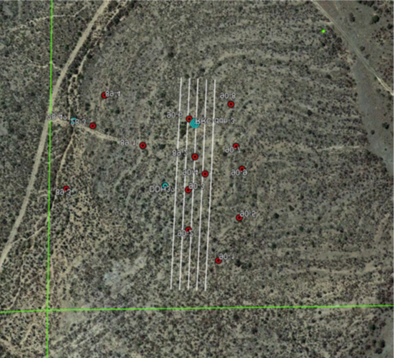 Liberty Star Redrock Canyon field (IP) survey layout. The white lines are the electrode arrays, and the red dots are previously drilled boreholes  Click Image to enlarge